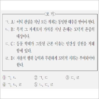 갑은 이익 관심을 가진 동물의 이익보다 중요하다고 간주 하면 안된다고 하니 싱어, 을은 동물의 개별적 복지를 강조하는 레건, 인간에 대한 의무만을 중시하니 칸트임을 알 수 있습니다. 지금부터 인간 중심주의의 칸트와 동물 중심주의의 싱어와 레건에 대해 알아보겠습니다.