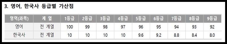 영어와 한국사는 절대평가에 따른 등급을 통해 가산점을 적용합니다.