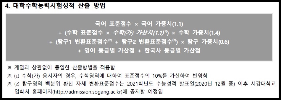 단, 수학 가형을 응시할 경우 수학의 표준점수의 가중치 1.1을 곱한 뒤에 수학 가중치 1.4를 곱하면 되겠습니다.