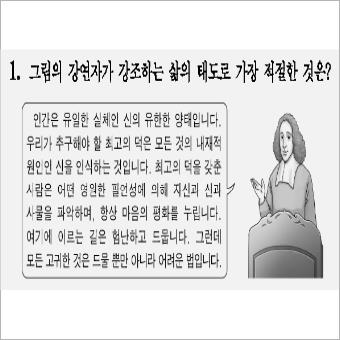 1번 문항은 그림의 강연자가 강조하는 삶의 태도로 가장 적절한 것은? 이라고 물었습니다. 강연자가 말하는 내용을 통해 이 강연자가 누구이며, 이 강연자가 주장한 내용에 대해 고르면 되겠습니다.