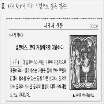 9번 문항에서는 (가) 왕조에 대한 설명으로 옳은 것은? 이라고 출제되었습니다. 제시문에 쓰여진 신문 기사를 통해 (가) 왕조가 어디인지 파악하고 그 시기에 있었던 사실을 고르면 되겠습니다.